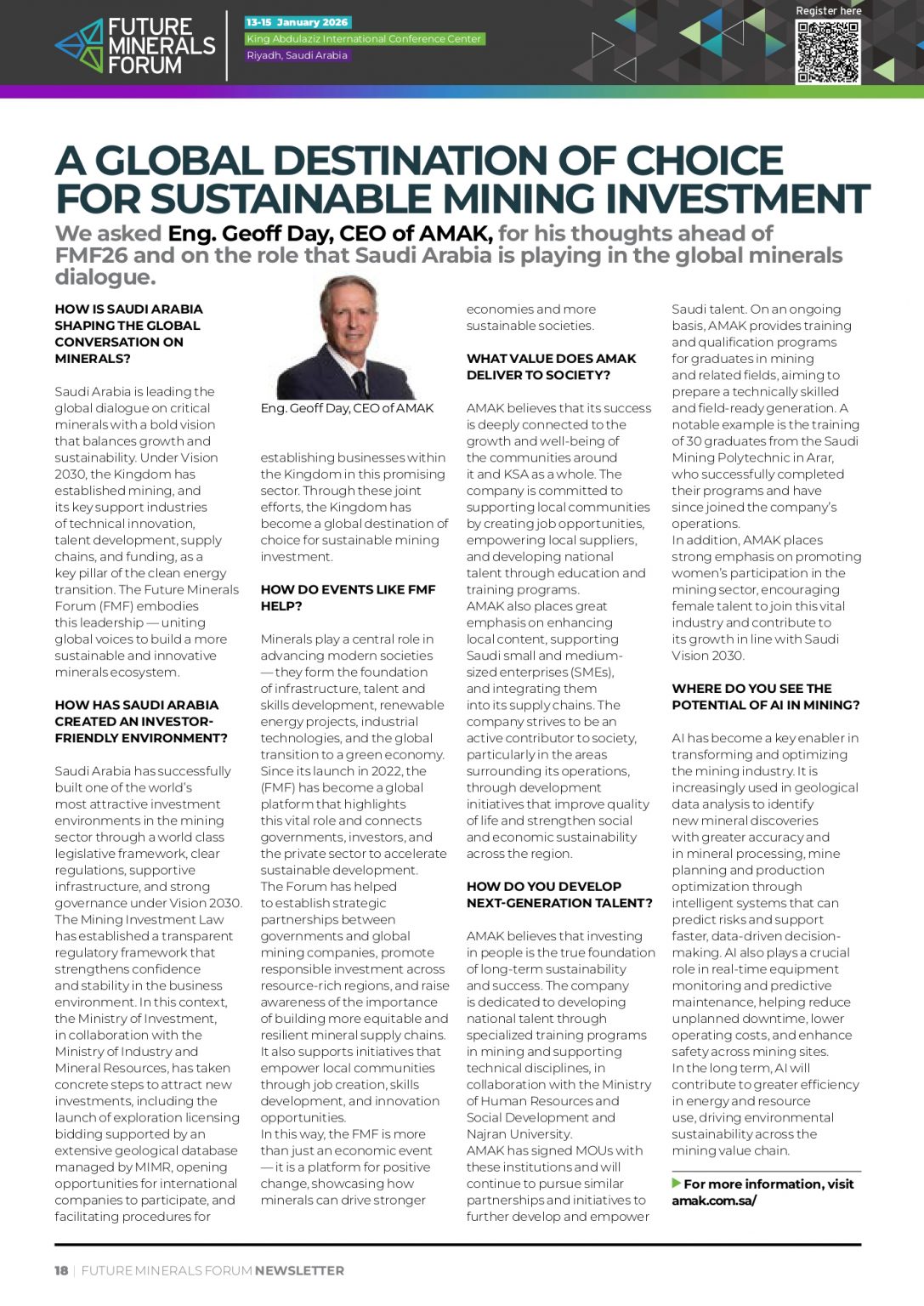 Almasane Alkobra Mining Company (AMAK) was honored to participate in the Future Minerals Forum (FMF) 2026, in its fifth edition, held in Riyadh, as a Strategic Sponsor, reaffirming the Company’s continued commitment to active annual participation and to supporting the development of the mining sector in the Kingdom of Saudi Arabia, in line with Saudi Vision 2030.